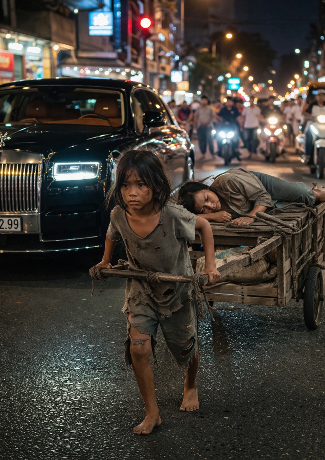Una niña pequeña estaba junto a su lujosa camioneta negra, con las piernas cubiertas de polvo, el cabello enredado y los ojos abiertos de par en par, llenos de miedo. A su lado había un carrito de madera viejo y tambaleante. Dentro, yacía una mujer.